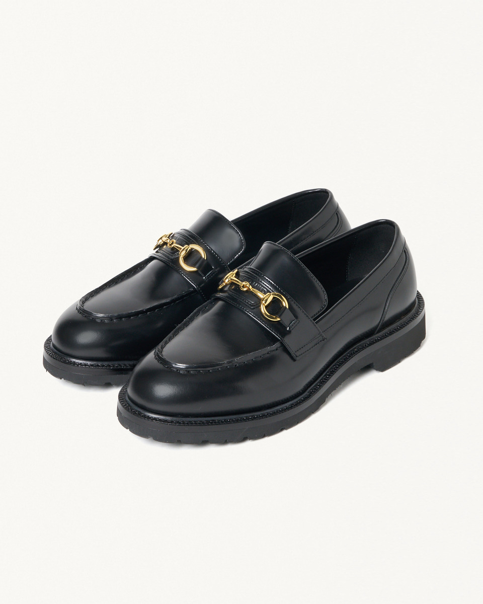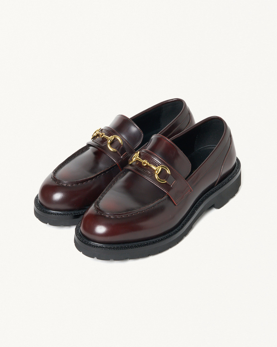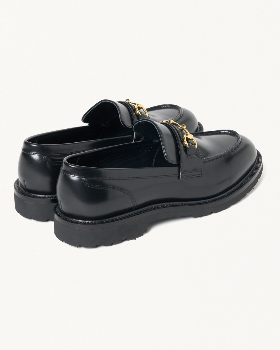 アッパーデザインは、カジュアルからドレススタイルまで幅広く対応するビットローファーをベースに、存在感のある拝みモカ縫いで立体的な表情を演出。ビットはゴールドカラーで別注し、その下には両ブランド名を刻印した台形レザーパッチを配置することで、コラボレーションを象徴するディテールとしています。